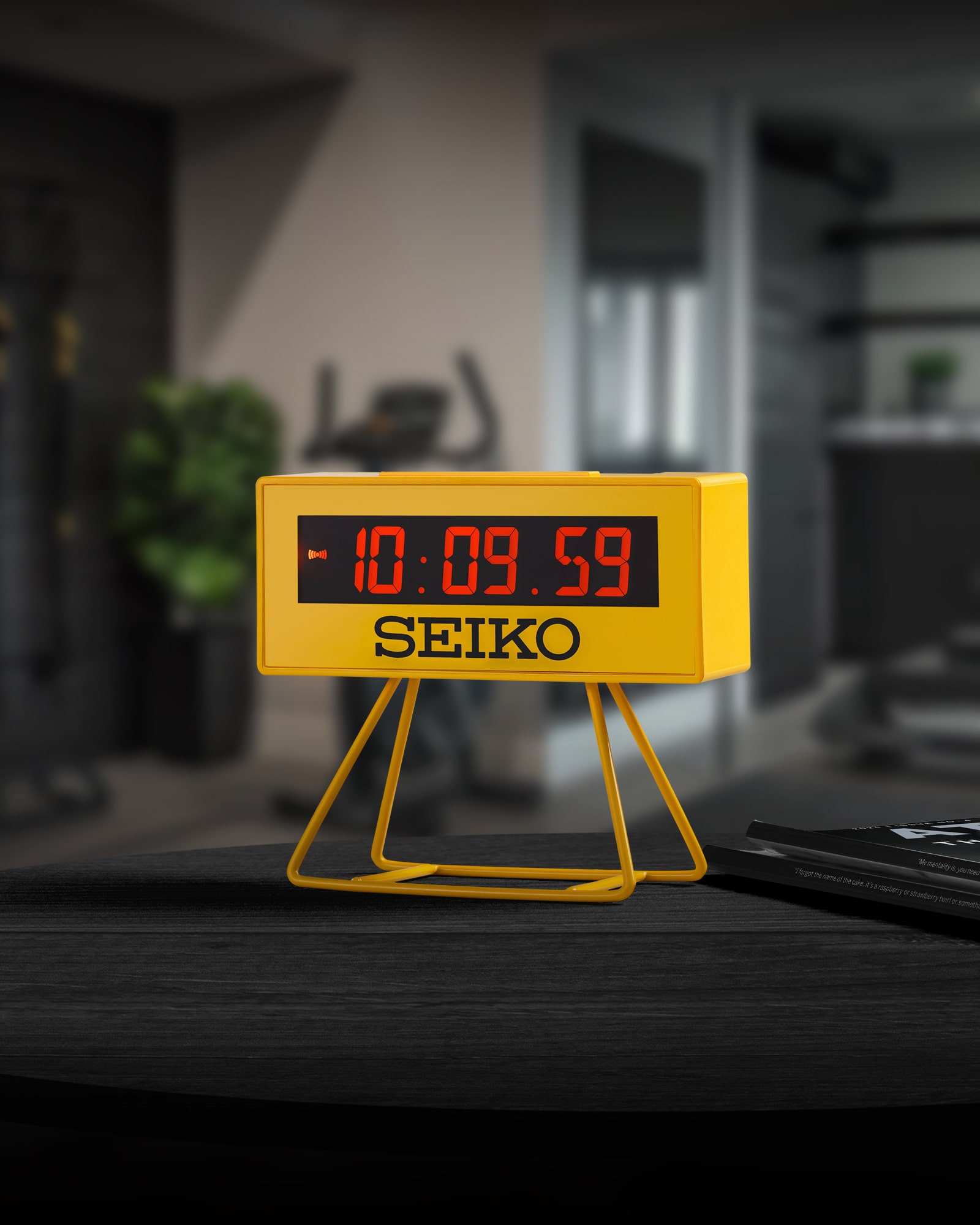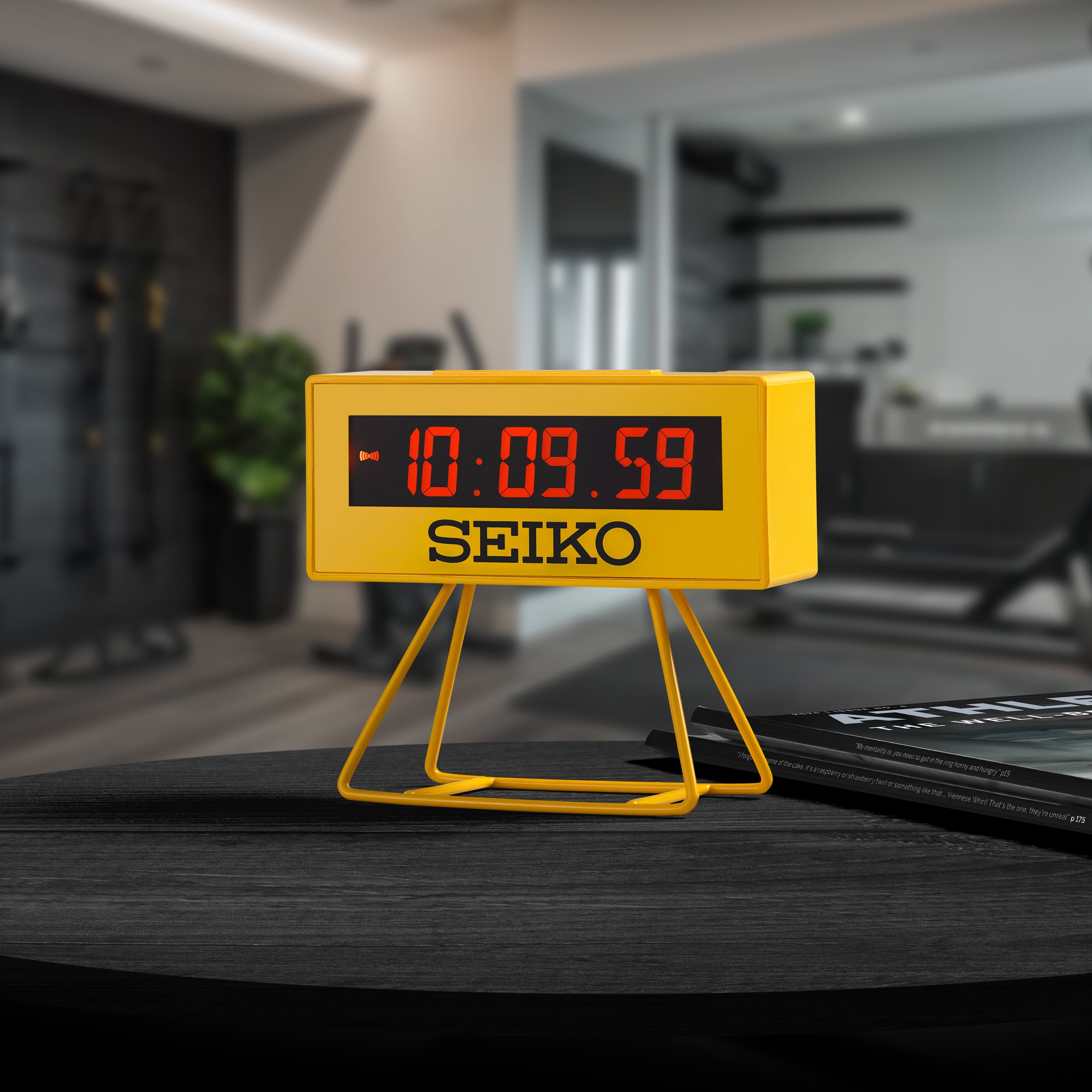 Designed for sports enthusiasts, this bold yellow alarm clock combines Seiko’s iconic athletic timing with practical features like a beep alarm, countdown timer, and stopwatch.